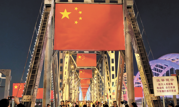 钢铁桥身与红色旗帜相映成趣,厚重历史与喜庆当下彼此交融。一位市民动情地说:“在国庆日来到这里,感受历史的厚重、分享节日的喜悦,这样的体验让我更加热爱我的城市,更加热爱我的祖国。”